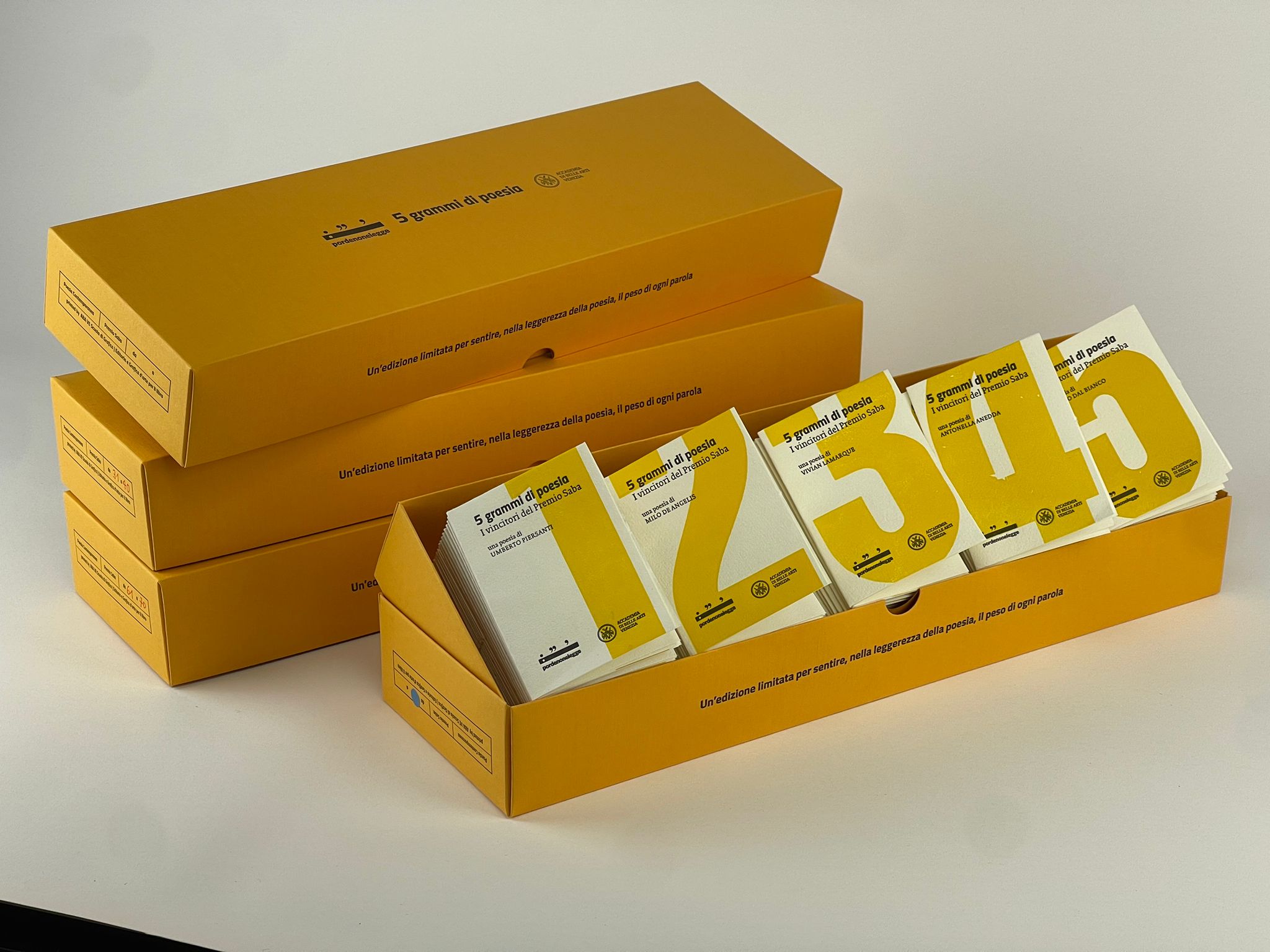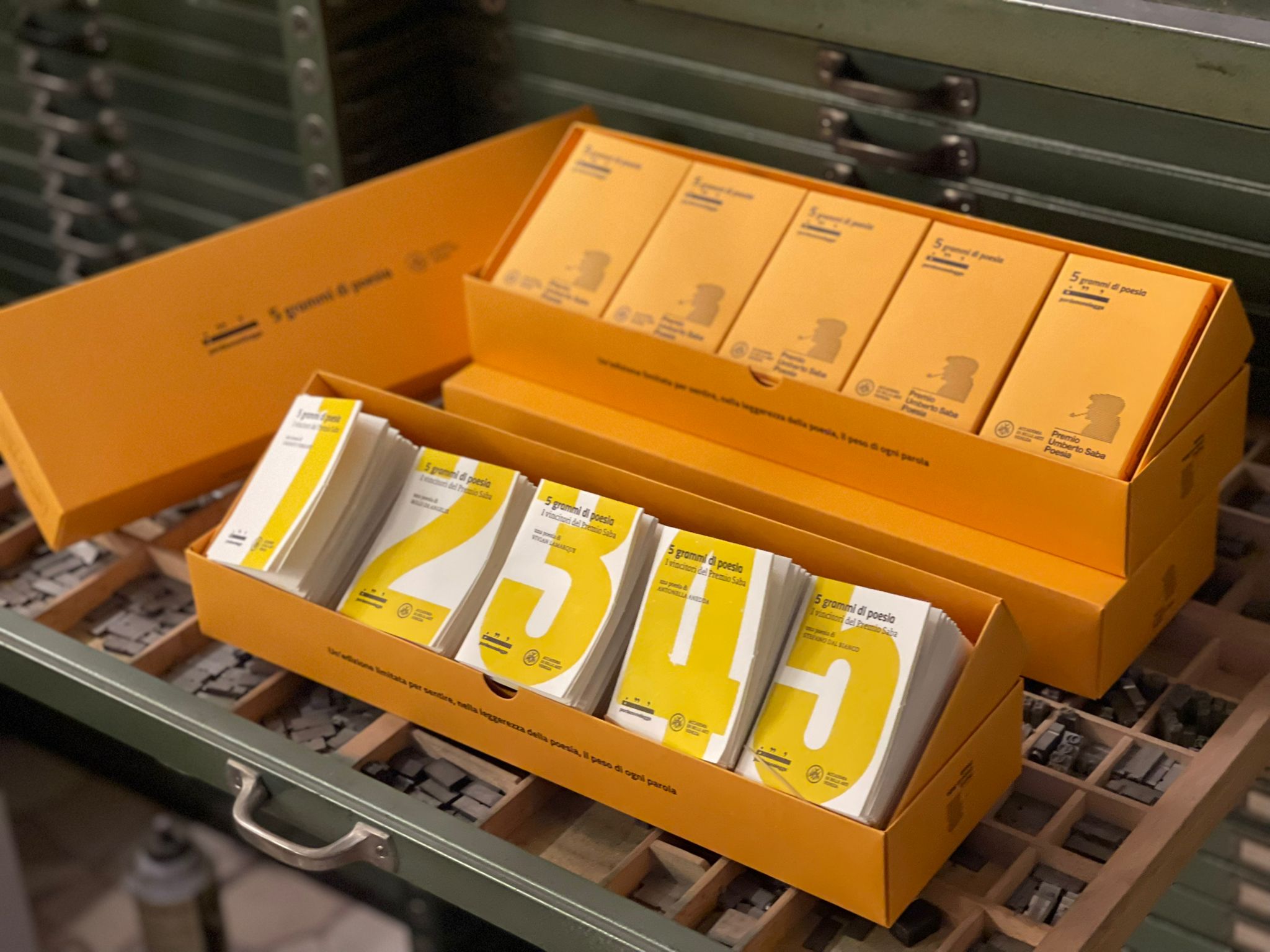 Il progetto, stampato dagli allievi dell’indirizzo Editoria e grafica d’arte per il libro della Scuola di Grafica d'Arte, si chiama 5 grammi di poesia, per le piccole dimensioni delle cinque plaquette stampate con i torchi a mano, che conterranno un inedito di Umberto Piersanti, Milo De Angelis, Vivian Lamarque, Antonella Anedda, Stefano Dal Bianco. Le poesie, stampate a tipoimpressione su carta cotone con i torchi tiraprove di precisione, si potranno trovare anche raccolte in una scatolina da collezione. Il progetto verrà presentato nell’ambito del festival durante un evento in collaborazione con l’Accademia di Belle Arti di Venezia, a cui interverranno il direttore dell’Accademia Riccardo Caldura, Giovanni Turria, Isabella Leardini curatori del progetto e il critico letterario Roberto Galaverni.