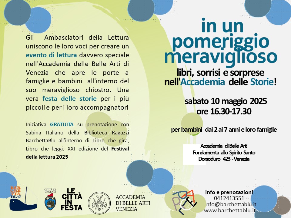 In occasione del Festival della Lettura 2025 - Libro che gira, libro che leggi, l' Accademia di Belle Arti di Venezia ospita l'incontro dedicato ai più piccoli e curato da Sabina Italiano dell'Associazione Barchetta Blu.