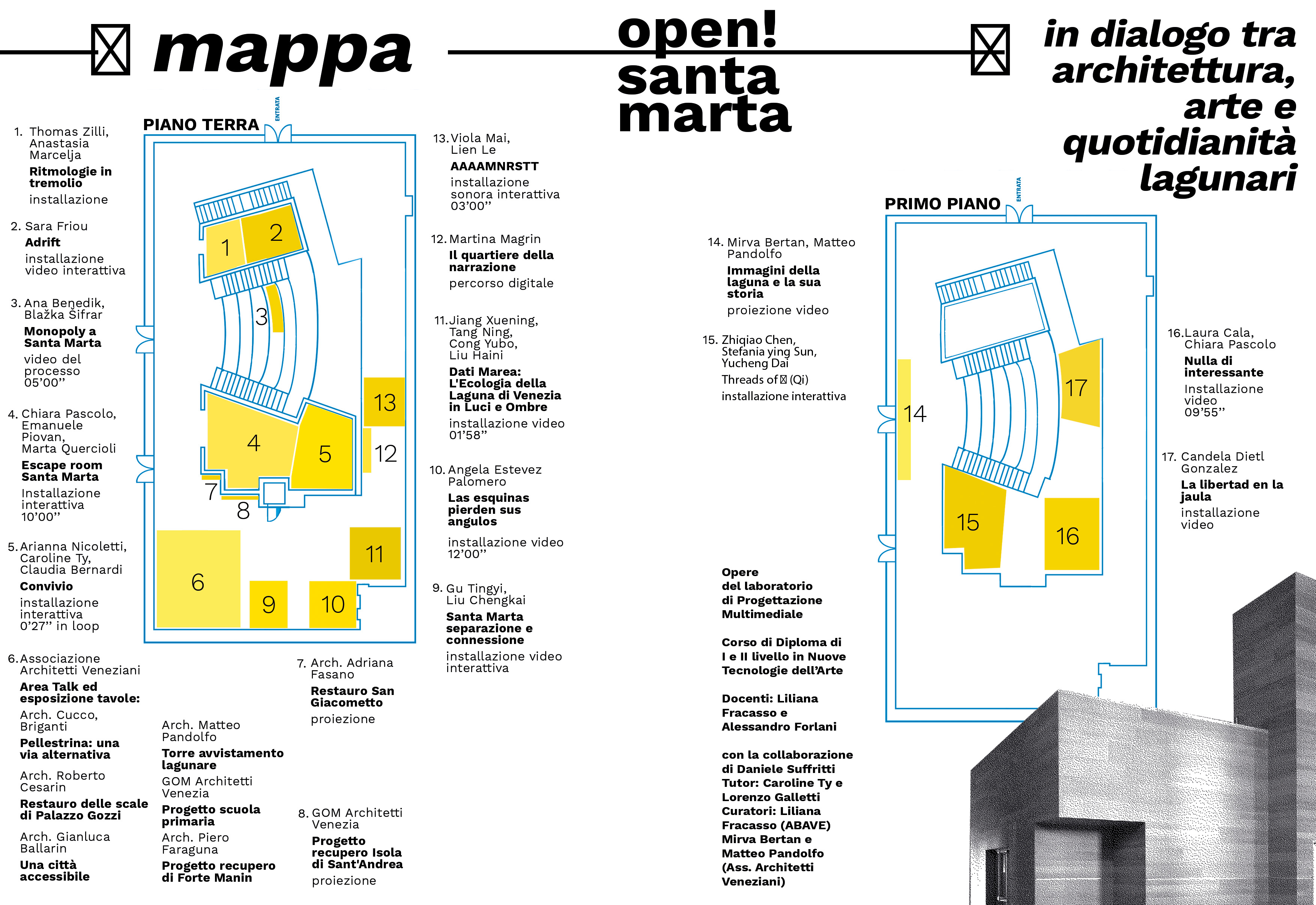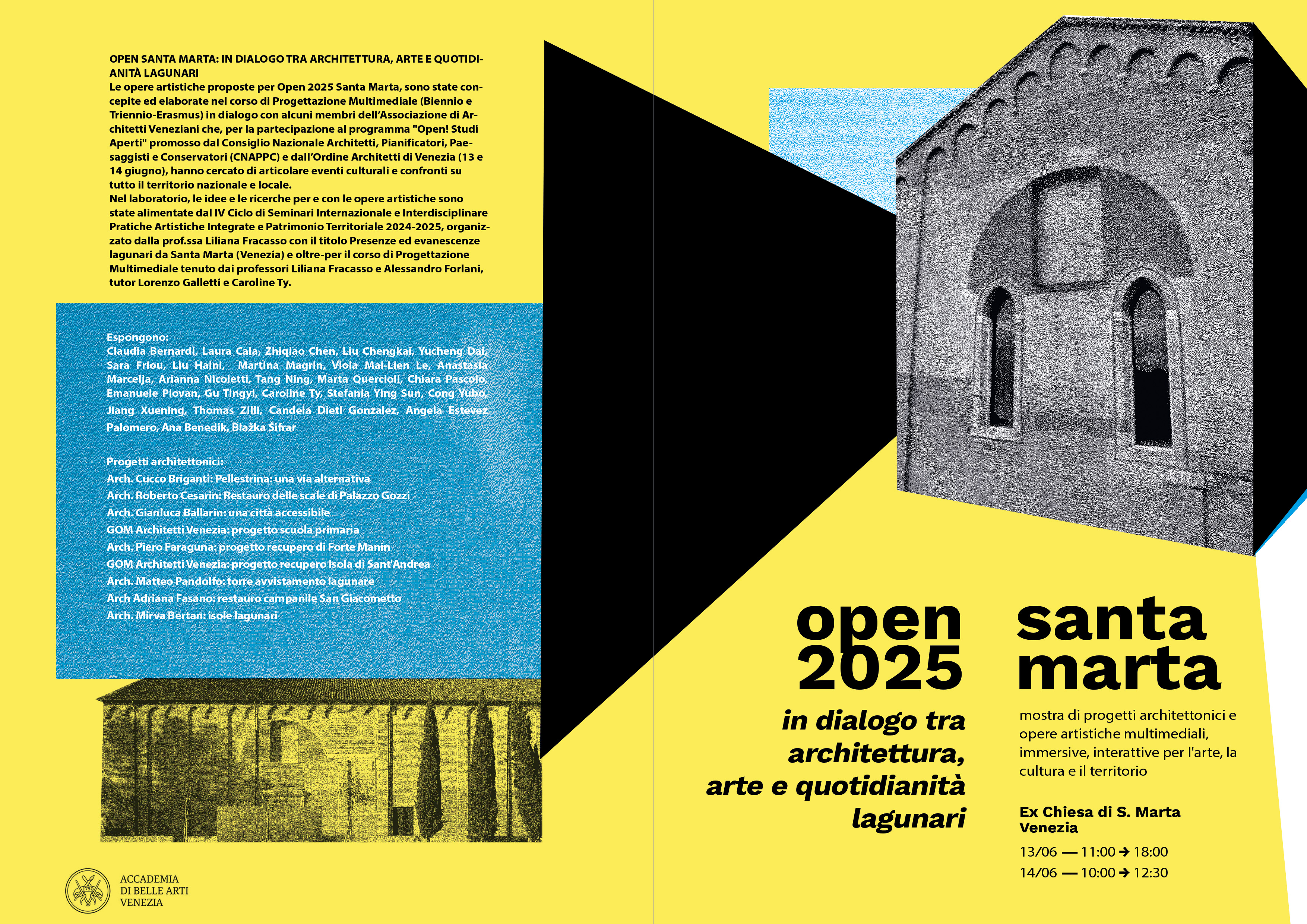 L’Accademia di Belle Arti di Venezia, in collaborazione con l’Associazione Architetti Veneziani e gli studenti del corso di Progettazione Multimediale della Scuola NTA, ospita venerdì 13 e sabato 14 giugno 2025, nella Sede di Santa Marta, l’evento pubblico OPEN! 2025. Verranno presentati progetti di architettura che analizzano temi come: l’utilizzo dello spazio pubblico, il superamento delle barriere architettoniche, la riqualificazione di isole ed edifici di valore storico, ambientale e sociale. Fanno da contrappunto le opere artistiche multimediali, interattive e immersive degli studenti create su tematiche comuni ai progetti architettonici, ma esplorate direttamente nei luoghi in maniera empirica, sensibile e riflessiva.