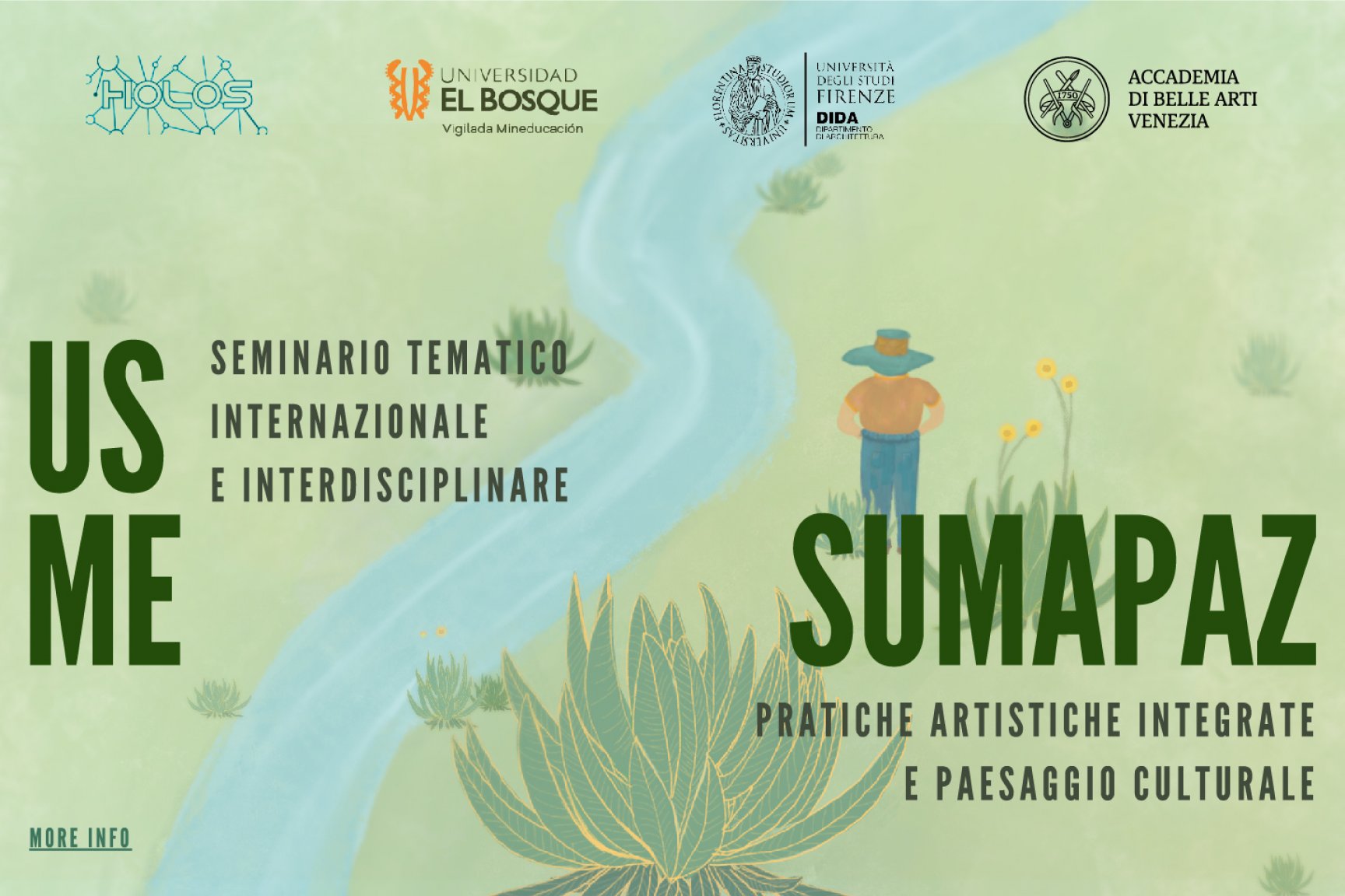 Il seminario Usme-Sumpaz Pratiche Artistiche Integrate e Paesaggio Culturale si offre agli studenti del Laboratorio del corso di Progettazione Multimediale a.a.2021_2022 Scuola Nuove Tecnologie dell'Arte - Nuovi media - Pratiche artistiche integrate ed agli studenti di architettura dell’Universidad El Bosque (Col) con lo scopo di attivare un laboratorio in rete, interdisciplinare ed interistituzionale a sostegno del progetto di solidarietá “Paesaggio, patrimonio e memoria in habitat popolare: Usme e paramo di Sumapaz” che si sviluppa tra i partners Universidad El Bosque, Universitá degli Studi di Firenze-DIDA.